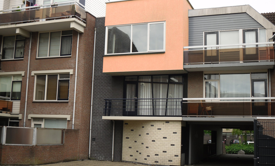 van een ruim balkon over bijna de gehele breedte van de woning. De derde laag is de