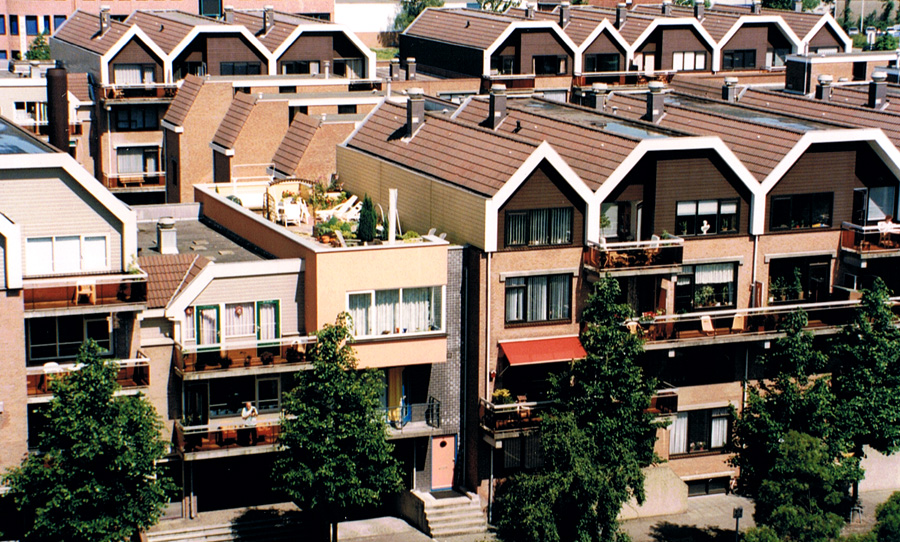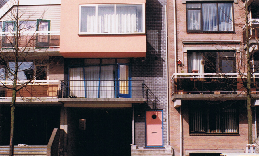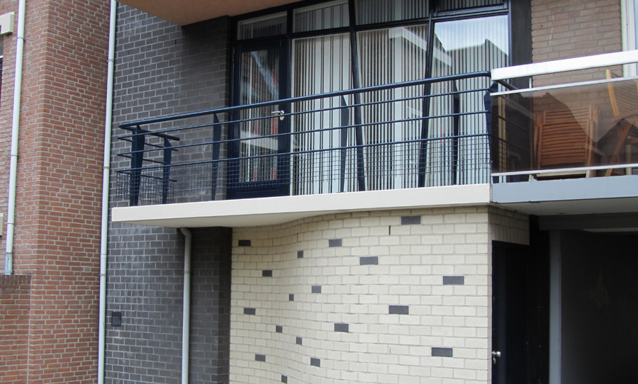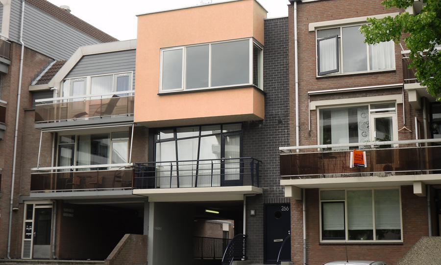 van een ruim balkon over bijna de gehele breedte van de woning. De derde laag is de