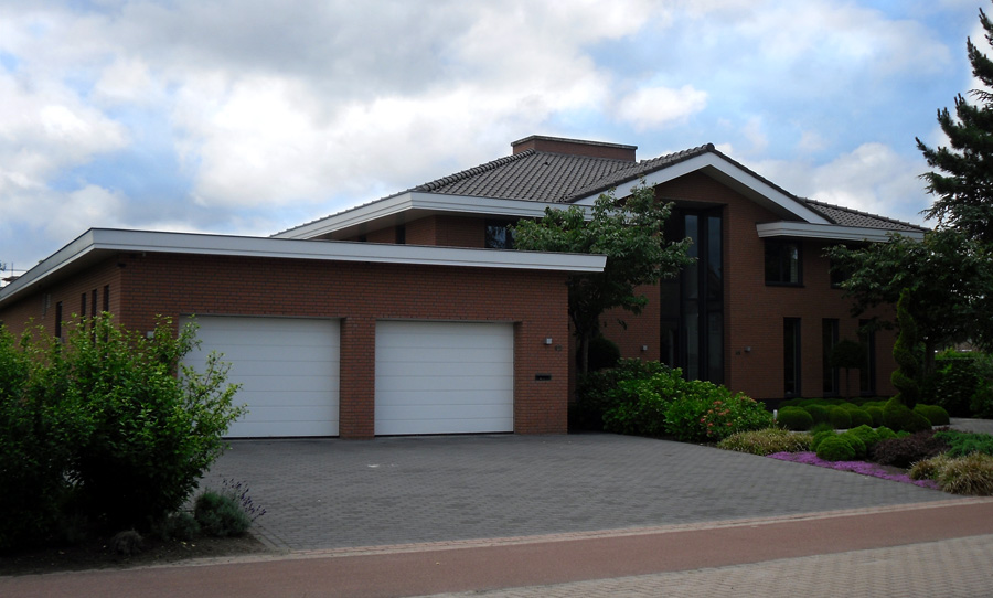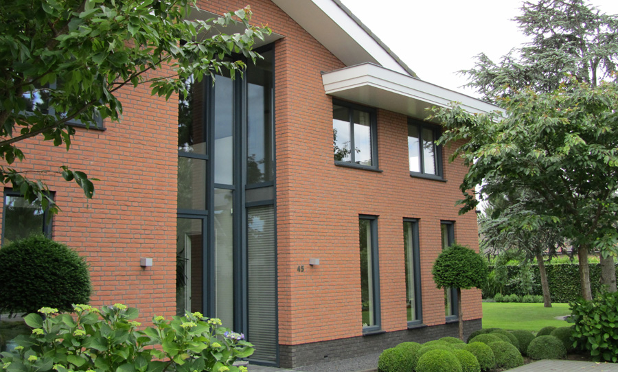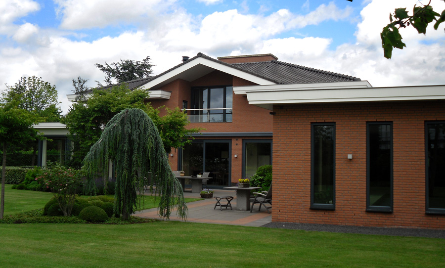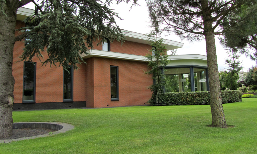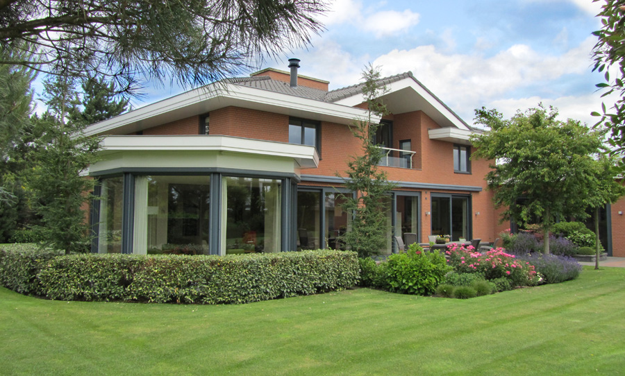 De villa heeft een klassiek Amerikaanse uitstraling met flauwe dakhellingen en grote gootoverstekken.